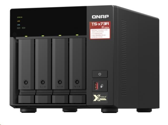 Disponuje čtyřjádrovým procesorem AMD Ryzen™ řady V1000 V1500B, který poskytuje vysoký výkon systému díky až čtyřem jádrům / 8 vláknům a Turbo Core až 2,2 GHz. Zařízení TS-473A disponuje dvěma porty 2,5GbE RJ45 a dva sloty PCIe Gen 3, abyste mohli flexibilně nasazovat sítě 5GbE/10GbE. Dva sloty M.2 NVMe SSD pro technologii Qtier a SSD Cache umožňují neustálou optimalizaci úložiště. Zařízení TS-473A podporuje systémy QTS a QuTS hero, což uživatelům umožňuje flexibilně přepínat operační systém na základě jejich požadavků.