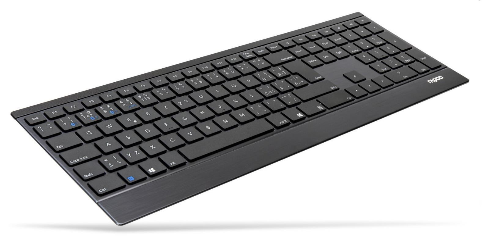 Tato ultratenká klávesnice spojuje prvotřídní materiály se stylovým designem. Tělo klávesnice vyrobené z nerezové oceli a hliníkové slitiny je nejen pevné a odolné, ale zároveň dodává pracovnímu stolu určitý styl. Klávesnice E9500M je nejen vyspělá konstrukcí, ale také funkcionalitou. Nabízí vícerežimovou technologii připojení firmy Rapoo – prostřednictvím spolehlivého bezdrátového vysílače 2,4 GHz, Bluetooth 3.0 a 4.1 – umožňuje současné připojení a přepnutí několika zařízení (s automatickým párováním). Navíc energeticky úsporná technologie firmy Rapoo zajišťuje životnost baterií až 12 měsíců, takže minimalizuje potřebu jejich výměny.