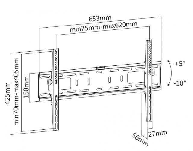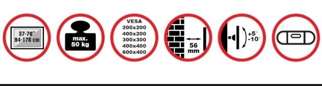 Nástěnný ocelový držák na Plasma a LCD TV s uhlopříčkou 37"- 70" (94-178cm) a hmotností maximálně 50kg. Konzole na zavěšení TV s vodováhou, vertikálně výklopný +5°/-10°, vzdálenost od stěny 56mm, materiál ocel, cenově výhodné, barva černá. Uchycení VESA: 200x200, 400x200, 300x300, 400x400, 600x400..