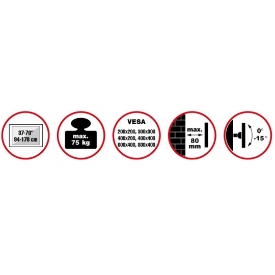 Nástěnný ocelový držák na televizory LCD s uhlopříčkou 37"- 70" (94-178cm) a hmotností maximálně 75kg. Uchycení VESA až 800x400, Středová konzole na zavěšení TV s upevněnými držáky, vertikálně výklopný +0°/-15°, vzdálenost od stěny 80mm, barva stříbrná. Uchycení VESA 200x200, 300x300, 400x200, 400x400, 600x400 a 800x400..