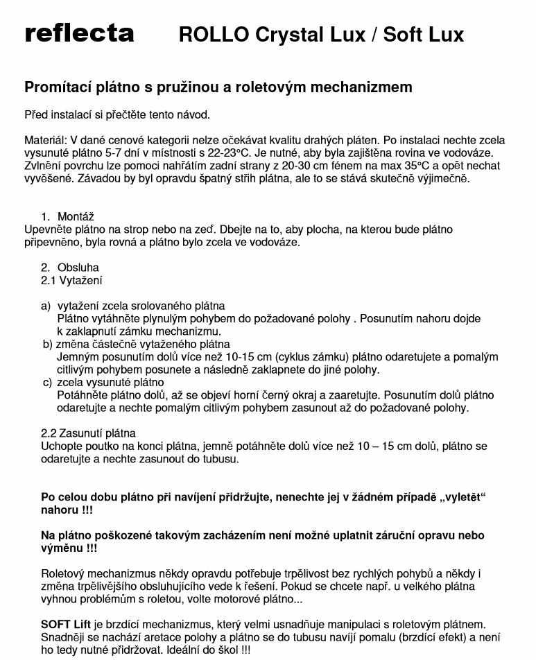 Roletové plátno SOFTLIFT CrystalLine 180x180cm s brzdou, viditelná plocha 1:1, 98"/250cm, 176x176cm, bílý hranatý kovový tubus 7x195cm/7kg, uchycení na stěnu/strop, materiál BetaLux - bílá 0,35 tkanina 300g/m2 s 2cm černým okrajem a zadní stranou, Gain=1,0, pozorovací úhel 120°. Lux - bílý matný povrch pro maximálně věrný a kontrastní obraz při alespoň částečném zatemnění. PVC materiál s textilním základem vytváří rovnou plochu bez zvlnění ale v krajích může docházet k prohnutí - postupně mizí. Snadné uchycení 4 vruty na plastových bocích plátna - stěna nebo strop. Možnost aretace polohy plátna při každé otáčce mechanizmu. SOFTLIFT mechanika brání prudkému zpětnému navinutí plátna a zároveň usnadňuje aretaci v požadované poloze. Ideální pro školy nebo místa, kde hrozí nesprávná manipulace s běžným ROLLO plátnem..