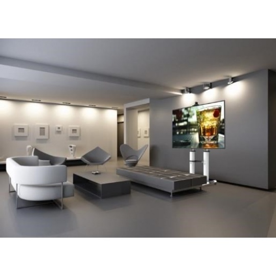 Moderní televizní stolek na Plasma a LCD TV s uhlopříčkou 60"- 100" (152-254cm) a hmotností maximálně 100kg. 2x teleskopická nosná tyč na kolečkách, držák otočný o 90° a vertikálně výklopný +5°/-10°, horní výškově nastavitelná plocha pro kameru, polička, AluDesign, barva stříbrná. Uchycení VESA: 200x200, 300x300, 400x200, 400x400, 600x400, 800x400, 800x600, 1000x600..