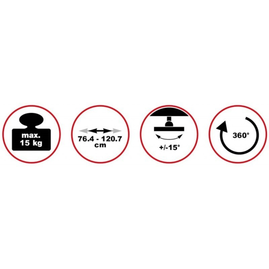 Nástěnný držák na dataprojektory - vzdálenost od stěny 76-120 cm, přístroj lze otočit o 360° a naklonit +/-15°, maximální zatížení 15kg, kabelový prostup, bílý. Univerzální systém uchycení dataprojektorů (rozsah 5,4-32 cm)..