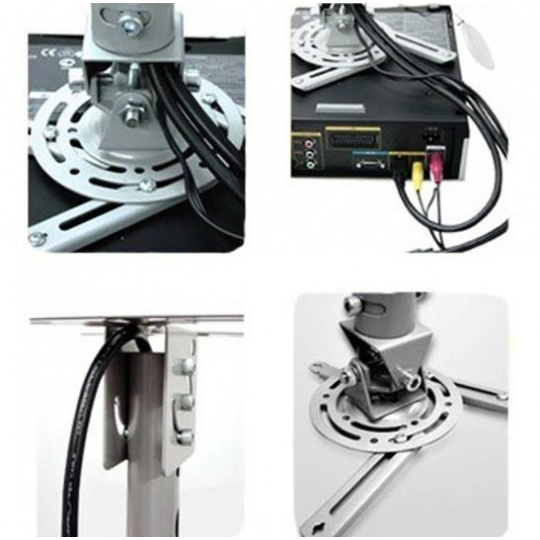 Stropní držák na dataprojektory - vzdálenost od stropu 57,5-82,5cm, přístroj lze otočit o 360° a naklonit +/-20°, maximální zatížení 20kg, možnost naklopení nosné tyče - vhodné na šikmé plochy, stříbrný. Univerzální systém uchycení dataprojektorů (rozsah 16-33 cm)..