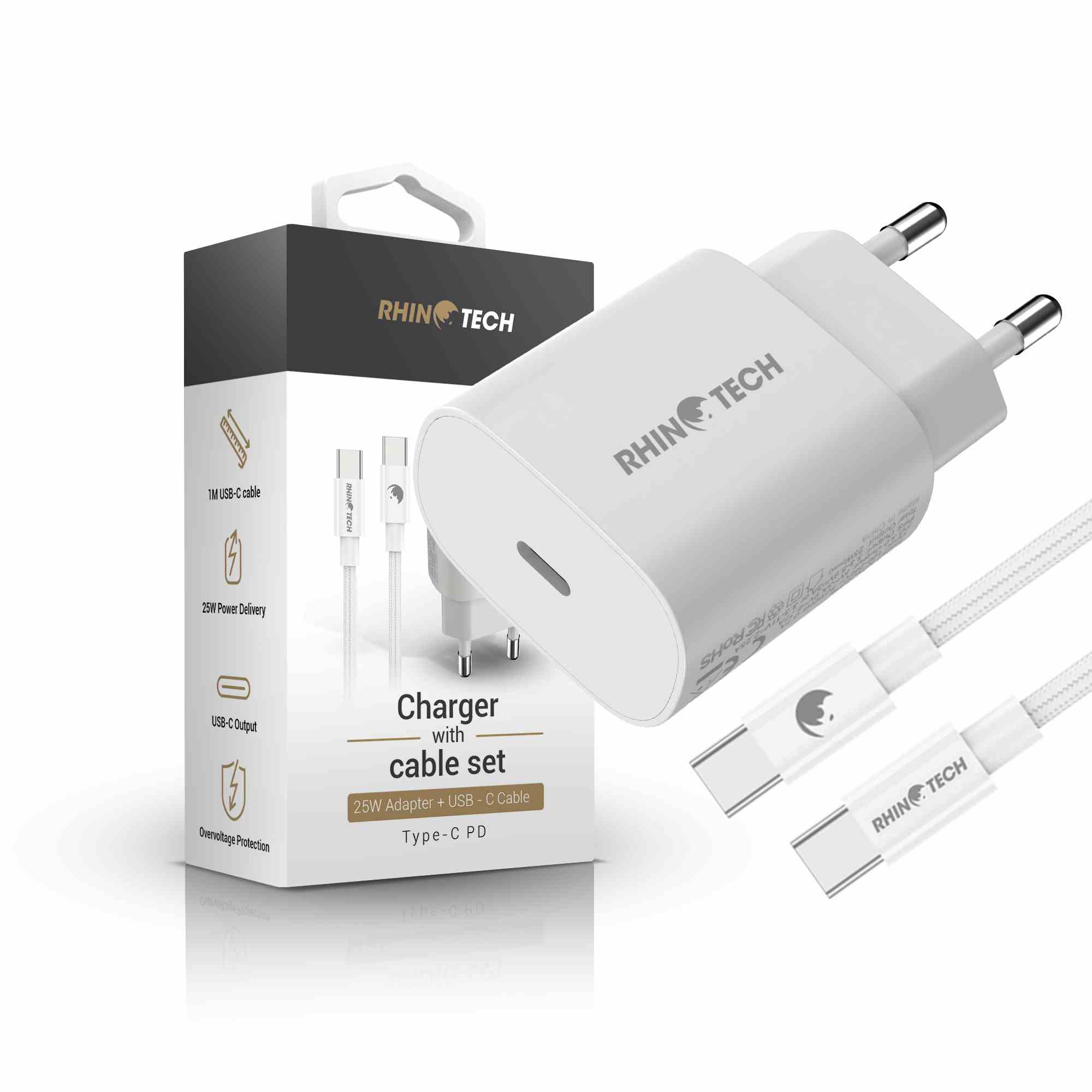 RhinoTech 25W PD nabíjecí adaptér s kabelem USB-C na USB-C 60W 1M bílá