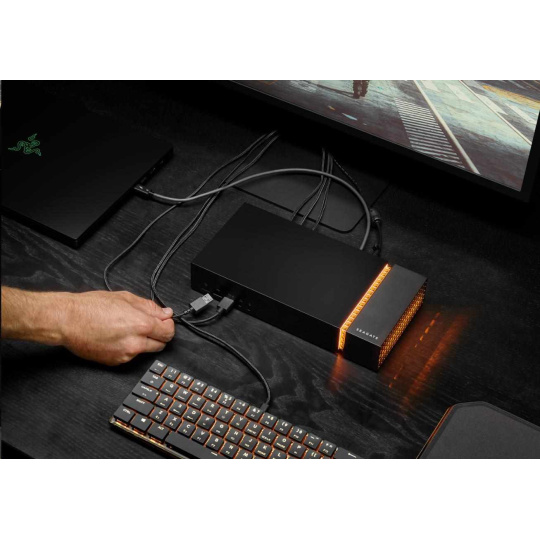 Hrajte tvrději s Seagate® FireCuda® Gaming Dock, elitním 4TB úložným hubem, který propojuje celou stolní bitevní stanici – klávesnici, myš, USB sluchátka, webovou kameru, monitor displeje a další – prostřednictvím jednoho kabelu Thunderbolt 3. Zapojte jej do notebooku a použijte rozšiřitelný slot M.2 NVMe pro práci s upgradem FireCuda 510 NVMe SSD pro přeplňované spouštění aplikací a doby načítání. Je dokonce vybaven přizpůsobitelnými RGB LED světly pro rovnoměrné osvětlení.