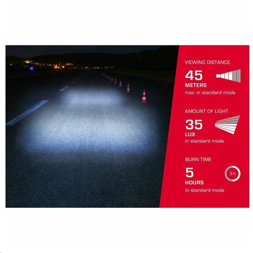 Aura 35 USB s CREE LED pro konstantní světelný výkon má intenzitu osvětlení 35 luxů ve 3 zónách - středové, bočních a daleké. To zabezpečí vynikající viditelnost a větší bezpečnost v silničním provozu.