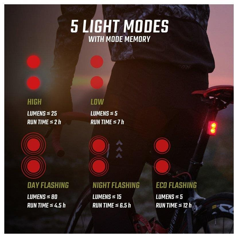 - 5 světelných režimů: High (25 lm), Low (5 lm), Day Flashing (80 lm), Night Flashing (15 lm), Eco Flashing (5 lm)