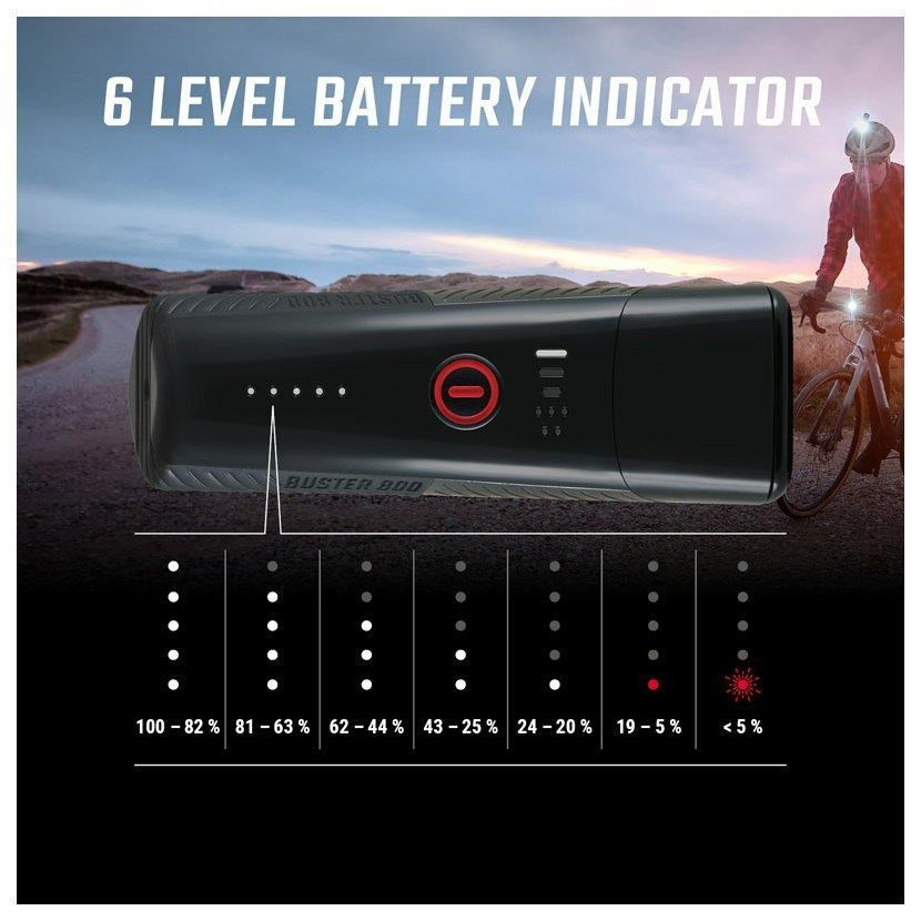 Se světlem Buster 800 s CREE LED uvidíte parádně i ve tmě a nic vám nebrání v nočních dobrodružstvích. Svítivost 800 lumenů a dosvit 170 metrů se postarají o optimální osvětlení i těch nejtemnějších cest. Pět různých světelných režimů nabízí flexibilitu při kombinaci intenzity světla a výdrže baterie. Indikátory LED na horní straně světla přehledně zobrazují, jaký režim je momentálně vybrán a jak dlouho ještě vydrží baterie. Můžete být v závislosti na světelném režimu na cestách až 30 hodin. Pět přednastavených režimových profilů se postará o extra uživatelský komfort.
