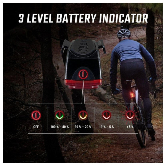 5 světelných režimů: High (40 lm), Low (5 lm), Day Flashing (150 lm), Night Flashing (25 lm), Eco Flashing (5 lm)