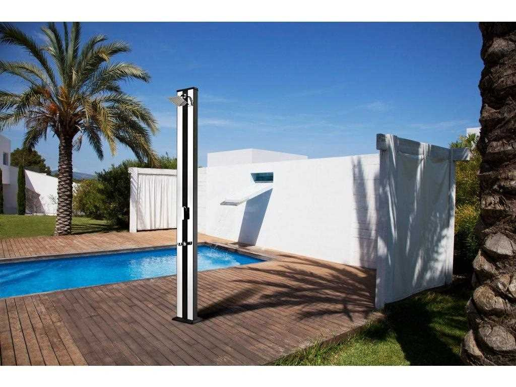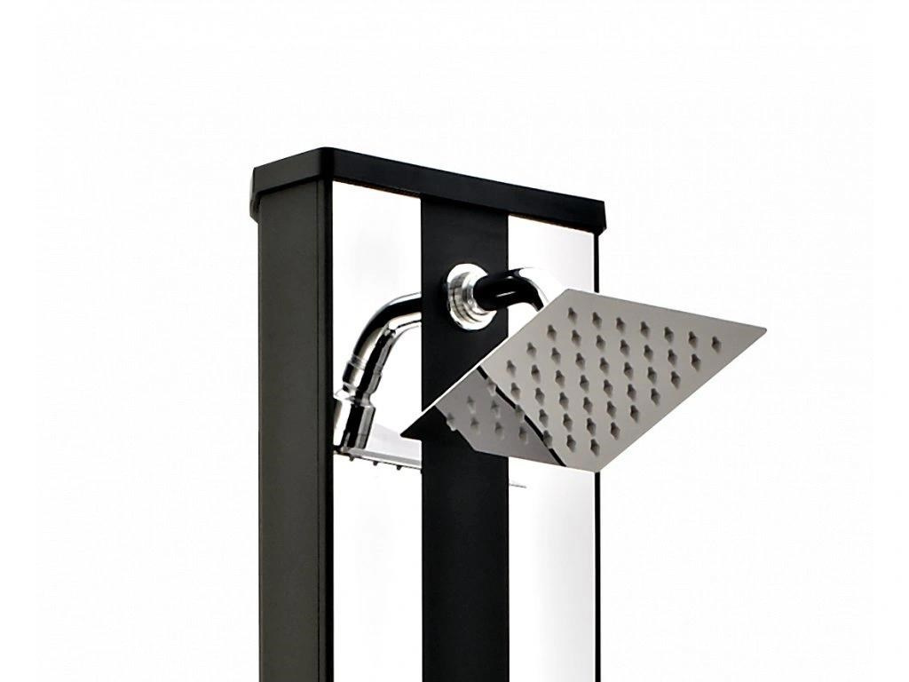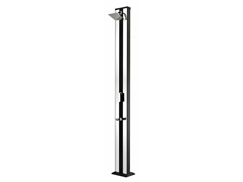 Hliníková solární sprcha s XXL zásobníkem o objemu 38 l a velkou sprchovací hlavicí, která zajišťuje příjemné sprchování připomínající lehký letní deštík. Sprcha je vyrobena z hliníku a nerezu, má kovovou pákovou baterii a je vysoká 218 cm. Je vybavena praktickým kohoutkem na oplach nohou. Celkově je sprcha velmi kvalitně zpracována a má luxusní vzhled. Připojení na přívod vody je velmi jednoduché pomocí hadicové rychlospojky (součástí balení).
