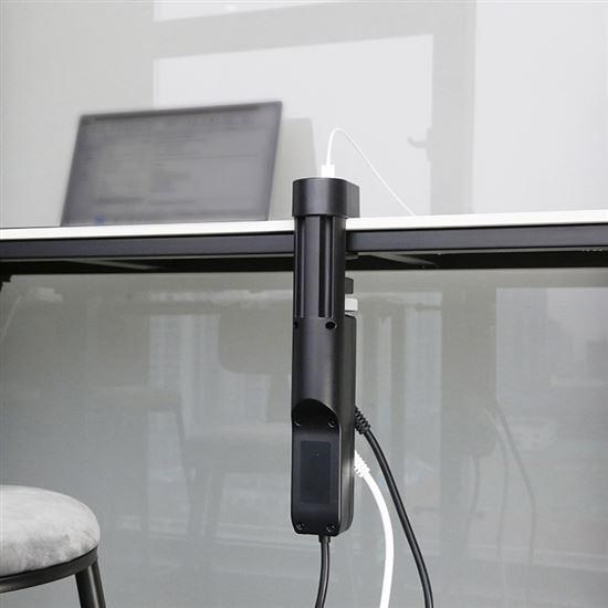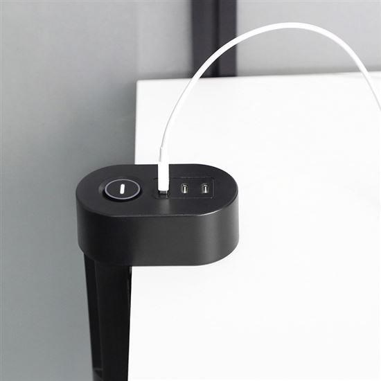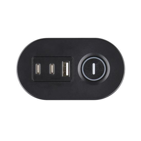 zásuvky 230V schované pod stolem, USB nabíječka a centrální vypínač přístupné shora