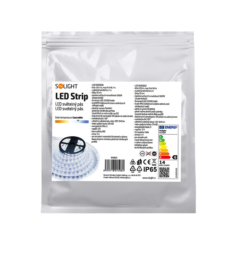 Solight LED světelný pás, 5m, SMD5050 60LED/m, 14,4W/m, IP65, studená bílá