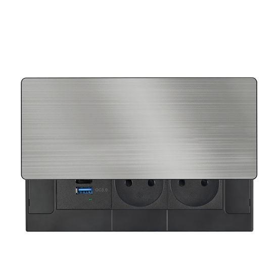 Vrchní kryt z matné tmavé nerez oceli (inox) působí elegantně a přirozeně zapadne do moderního interiéru. Nízký profil, čisté linie a nenápadné posuvné otevírání zachovávají vzhled pracovní plochy. Zásuvky i nabíjecí porty jsou kdykoli snadno přístupné jednoduchým pohybem ruky.
