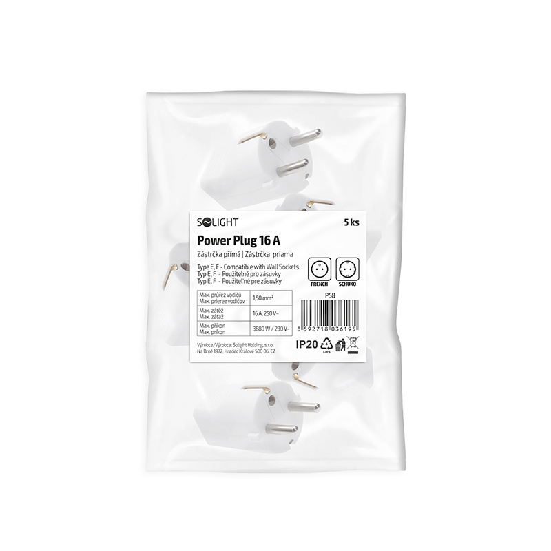 Solight zástrčka přímá, IP20, bílá