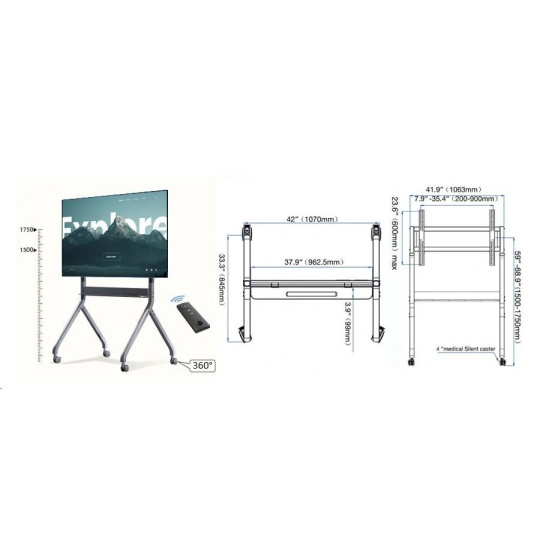 Kvalitní, velmi pěkný pojízdný televizní stojan s elektrický pohonem pro úpravu výšky obrazovky od 1500 mm do 1750 mm. Stojan má polici na příslušenství 962x99 mm s integrovaným ovládacím panelem, 4 otočná pojezdová kolečka s aretací a držák Tv s podporou VESA 200x200 až 900x600. Součástí balení je i dálkové ovládání. Vynikající ocelová konstrukce s nosností 90,9 kg zajišťuje vynikající pevnost, stabilitu a odolnost. Na stojan poskytujeme záruku 3 roky. Stojan na interaktivní tabuli / televizi / dotykovou obrazovku / monitor NB P220 Popis: Univerzální mobilní stojan pro středně velké a velké obrazovky Perfektní řešení pro interaktivní tabule a multimediální obrazovky Široká, stabilní základna se snadným přístupem k dotykovým obrazovkám Elektrické nastavení výšky obrazovky Kvalitní materiály, velmi pevná a odolná konstrukce Police na příslušenství s ovládacím panelem Podpora standardu VESA Jednoduchá a rychlá montáž Ideální pro konferenční místnosti, školy, na výstavy, prezentace, přednášky nebo pro soukromé použití Čtyři otočná kolečka s funkcí aretace Vysoká nosnost, skvělá stabilita, tichý a spolehlivý motor Barevné provedení grafit Elektrický stojan na multimediální tabule a multimediální dotykové monitory NB P220 Technické údaje: Nosnost 90,9 kg Pro obrazovky 60" - 100" Podpora VESA standardů 200x200 až 900x600 Výškové nastavení v rozsahu 150 ~ 175 cm Otočná kolečka o průměru 75 mm s funkcí aretace Pevná ocelová konstrukce Spodní police na příslušenství s ovládacím panelem, rozměry: 962 x 99 mm Dálkové ovládání Výkonný motor 75W Napájení 240V / 110V Povrchová úprava: práškový lak Barva: grafitová Záruka 3 roky.
