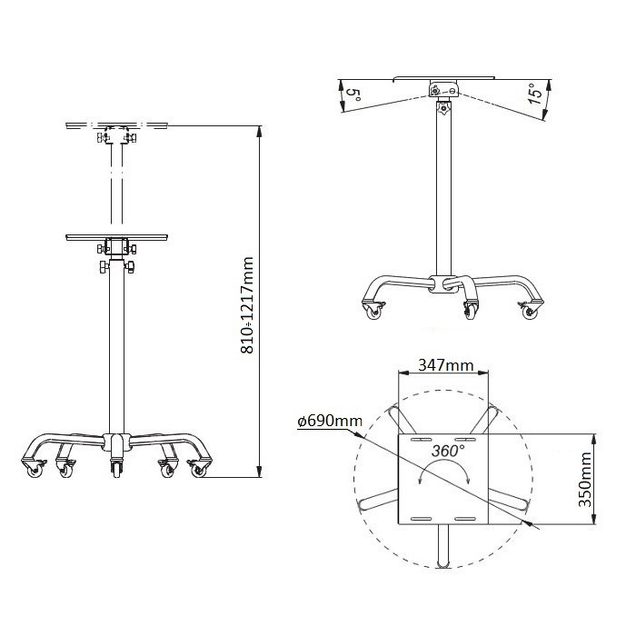 Pojízdný stolek na projektor nebo notebook EDBAK PT03 Profesionální plně nastavitelný podstavec na dataprojektor nebo notebook v profesionálním provedení. Nastavitelná výška 810-1217 mm, náklon +5° / -15°, otočný do stran +/- 10°, rozměr podstavy 510x460 mm. Barevné provedení černé s chromovým nosníkem. Pojezdová kolečka jsou opatřena brzdou. Pojízdný stolek, stojan na projektor nebo notebook Technické údaje: nosnost 15 kg rozměry podstavce 350x347 mm minimální výška 810 mm maximální výška 1217 mm otočný +/- 10° sklopný +5° / -15° mobilní verze s pojezdem pojezdová kolečka jsou opatřena brzdou barevné provedení černé profesionální stabilní bezpečná konstrukce záruka 5 let.