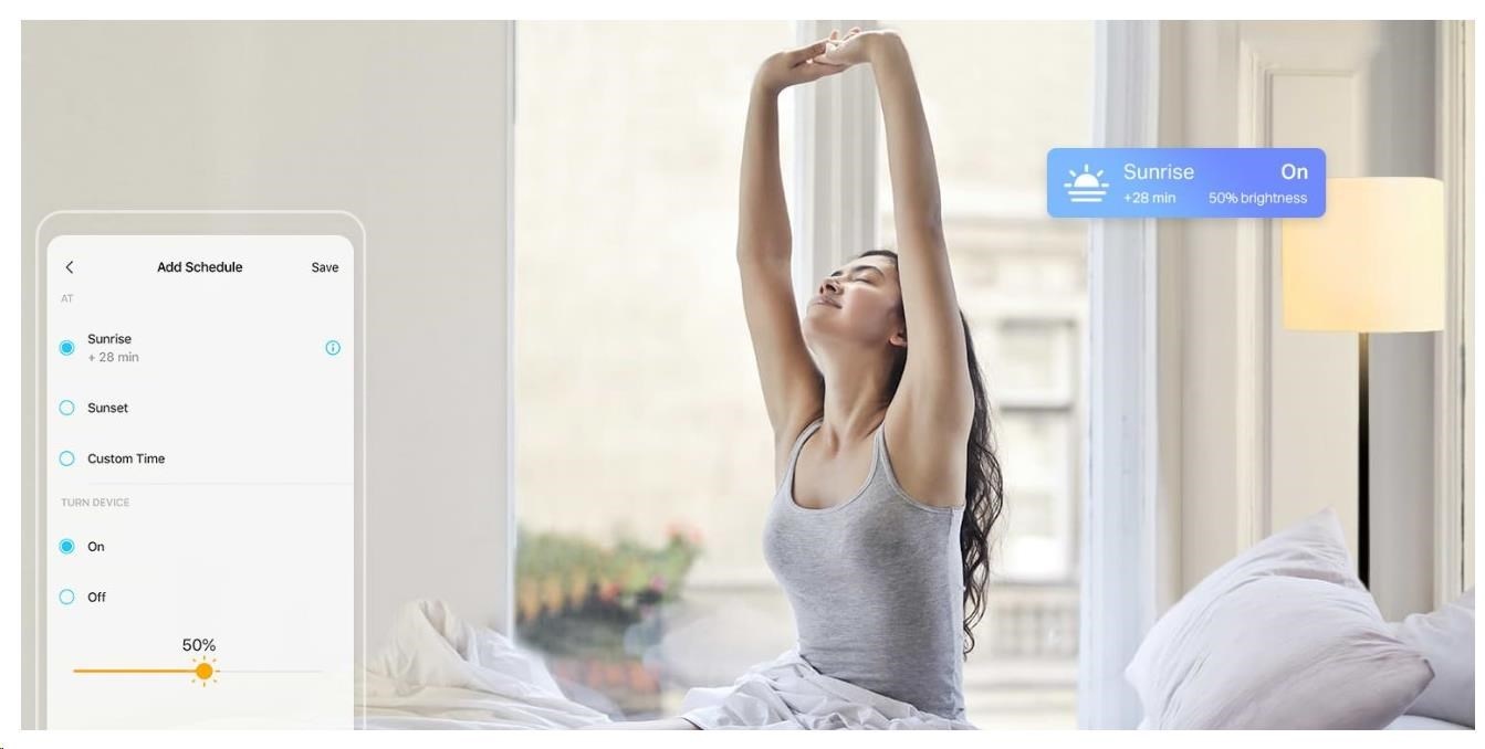 - Časový plán (nastavte si časy) – Vytvořte si pravidelný plán pro zapnutí/vypnutí s nastaveným jasem.