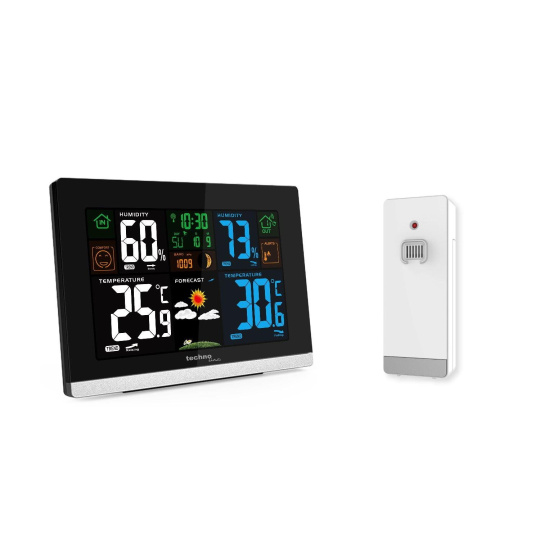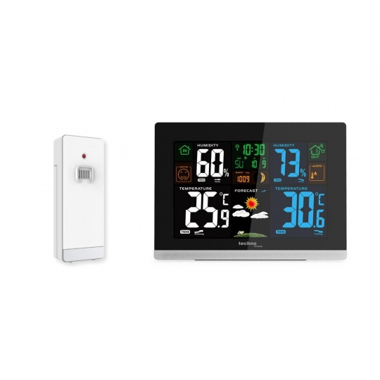 - barvy displeje: čas, datum zelená, barometrický tlak oranžová, vnitřní teplota a relativní vlhkost bílá, venkovní teplota a relativní vlhkost modrá