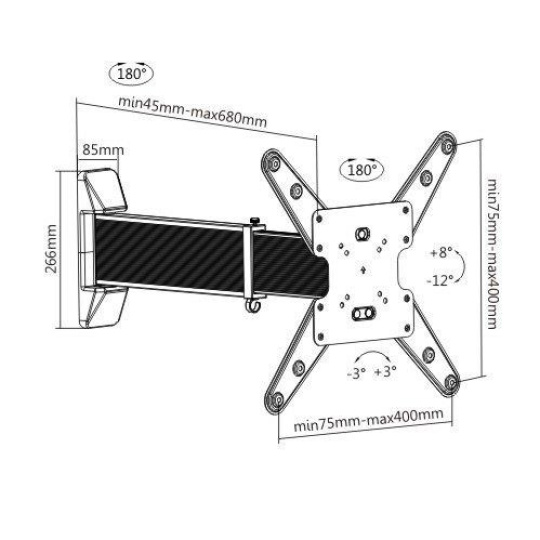 Teleskopický nástěnný držák na Tv Fiber Mounts Telescopic Držák unikátní teleskopické konstrukce, výsuvný, otočný, sklopný, na Tv 23-60", VESA standardy 75x75 až 400x400, nosnost 35kg Unikátní držák na televize, který má speciální teleskopickou konstrukci. Jedno rameno při vysouvání vyjíždí z druhého. Držák má nastavitelnou vzdálenost od zdi od 45mm do 680mm, podporuje VESA standardy 75x75 až 400x400 a je vhodný pro uchycení televizorů s hmotností až 35kg. Televizi můžete tedy vysouvat od zdi, otáčet do stran a naklápět. Držák je vhodný na zdi nebo do rohů místností. Luxusní konstrukce z hliníku v krásném černošedém provedení. Záruka 3 roky. Unikátní držák na Tv 23-60" s teleskopickou konstrukcí, výsuvný, otočný, sklopný - Fiber Mounts Telescopic Technické údaje: maximální zatížení 35 kg VESA standard 75x75 až 400x400 vhodný na Tv a monitory s úhlopříčkou 23-60" speciální teleskopická konstrukce výsuvný od zdi 45mm až 680mm otáčení do stran +/- 90° naklápění +8° až -12° korekce roviny +/- 3° luxusní provedení, hliníková konstrukce barva černošedá záruka 3 roky Držák na LCD LED Tv teleskop Fiber Mounts Telescopic Teleskopický držák Tv Fiber Mounts Telescopic podporuje VESA standardy: VESA 75x75 VESA 100x100 VESA 200x100 VESA 200x200 VESA 300x300 VESA 400x200 VESA 400x400 Držák Tv Fiber Mounts Telescopic je vhodný pro zavěšení všech televizorů, jejicž hmotnost není vyšší jak 35kg a které podporují kterýkoliv z výše uvedených VESA standardů. Velikost televize není podstatná..