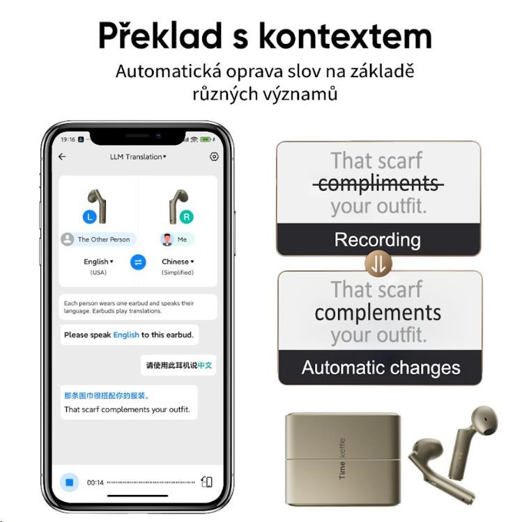 Překonejte jazykové bariéry v reálném čase s AI tlumočníkem a překladatelem Timekettle W4. Podporuje obousměrný překlad ve 42 jazycích a 95 dialektech, takže konverzace mezi různými kulturami je plynulá a přirozená. Ať už cestujete, pracujete nebo poznáváte nové lidi, W4 zajistí, že každé slovo bude správně pochopeno. Rozlučte se s trapnými pauzami a jazykovými nedorozuměními – stačí mluvit a AI se postará o zbytek. Komunikujte svobodně a sebevědomě kdekoliv na světě bez jazykových omezení. Přesnost překladu je až 98% a AI slovník na principu velkých jazykových modelů (LLM) zajistí díky perfektnímu porozumění přesnou opravu podobně znějících slov a celkovému porozumění kontextu konverzace. Aplikace Timekettle vám navíc z konverzací vytvoří přepis a AI shrnutí.