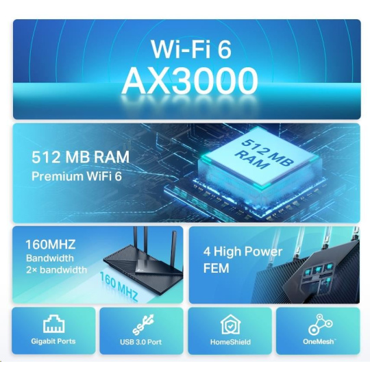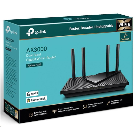 TP-Link Archer AX55 OneMesh/EasyMesh WiFi6 router (AX3000, 2,4GHz/5GHz, 4xGbELAN, 1xGbEWAN, 1xUSB3.0)