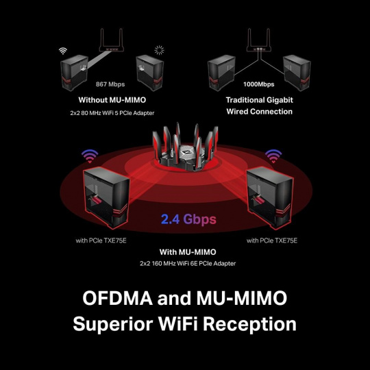 Archer TXE75E posune příjem Wi-Fi signálu vašeho počítače na novou úroveň, protože revolučně využívá kombinaci technologií OFDMA a MU-MIMO. Wi-Fi připojení počítače díky tomu může fungovat efektivněji, neboť větší počet zařízení může komunikovat s routerem současně, bez čekání na přenos dat ve frontě.