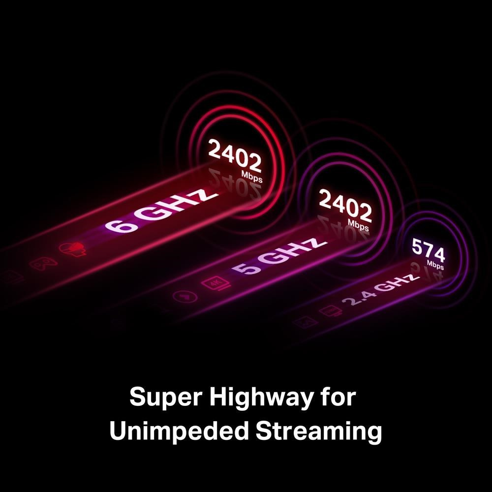 • Bezkonkurenční třípásmová rychlost — zvyšte celkové rychlosti až na 2 402 Mbit/s v pásmu 6 GHz + 2 402 Mbit/s v pásmu 5 GHz + 574 Mbit/s v pásmu 2,4 GHz.