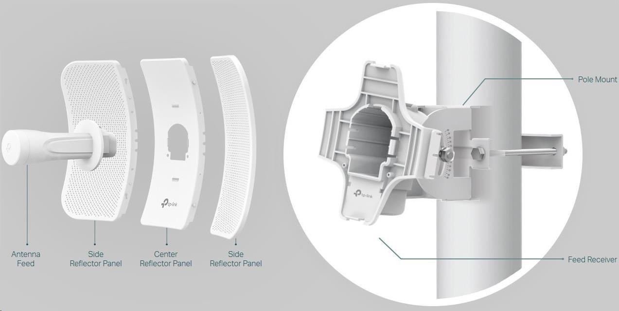 - Inovativní díly se zámkem zajišťují rychlou montáž a robustní konstrukční řešení, které udržuje CPE710 stabilní i za silného větru