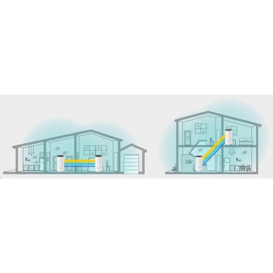 - Díky pokročilé Deco síťové technologii jednotky spolupracují na vytvoření jednotné sítě s jediným názvem sítě. Zařízení se automaticky přepíná mezi jednotkami Deco při vašem pohybu po domě pro dosažení nejvyšší možné rychlosti.