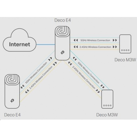 - Deco E4 poskytuje rychlé a stabilní spojení rychlostí až 867 Mb/s a spolupracuje s hlavními poskytovateli internetových služeb (ISP) a modemem.