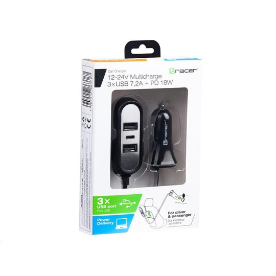 The TRACER 12-24V MULTICHARGE 3xUSB 7.2A + PD 18W car charger was created for both the driver and the passengers. It has a total of 3 USB ports for charging mobile devices or navigation as well as a USB-C port with PD 18W function, which allows you to charge selected Macbooks and netbooks that support the newest technology. It is a small and classy-looking device useful on every journey. In total, it supports up to 7.2A.