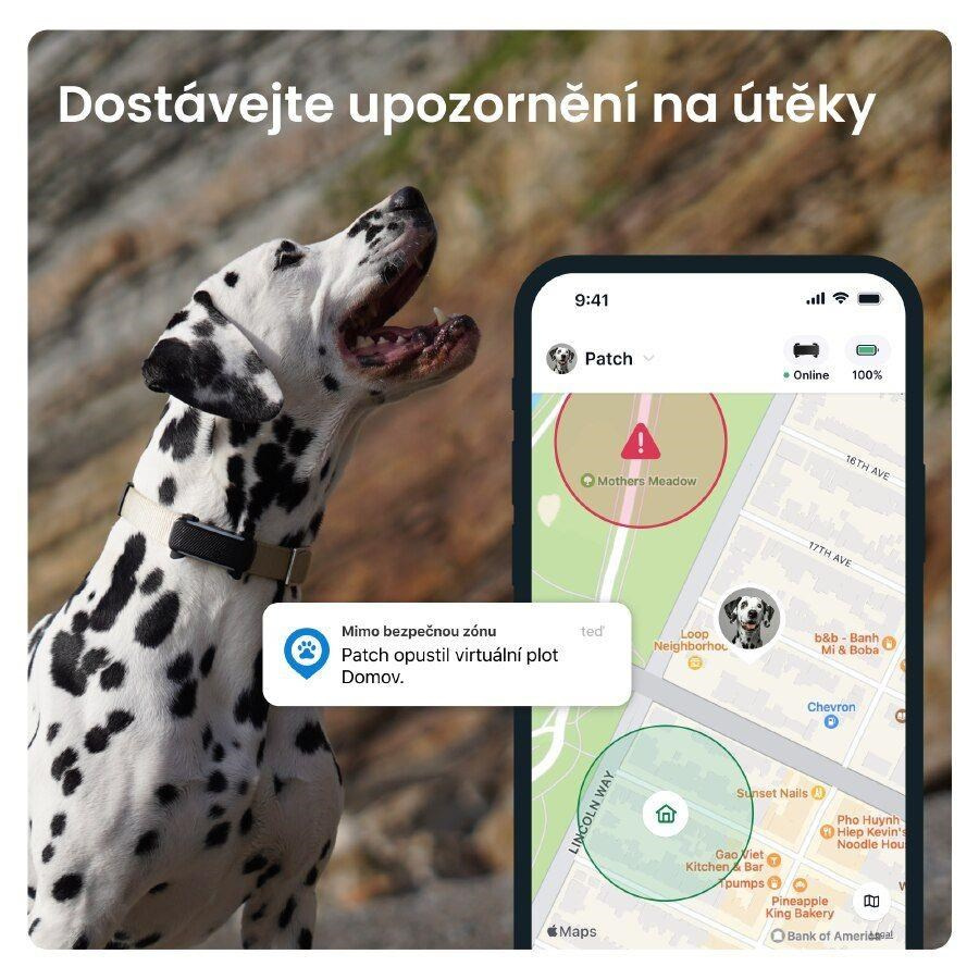 GPS tracker pro psy je 100% vodotěsný, odolný proti nárazům a jeho baterie vydrží až 10 dnů. Pasuje na většinu obojků a postrojů. Je určen pro psy o hmotnosti nad 4 kg.Zprávy o nebezpečí