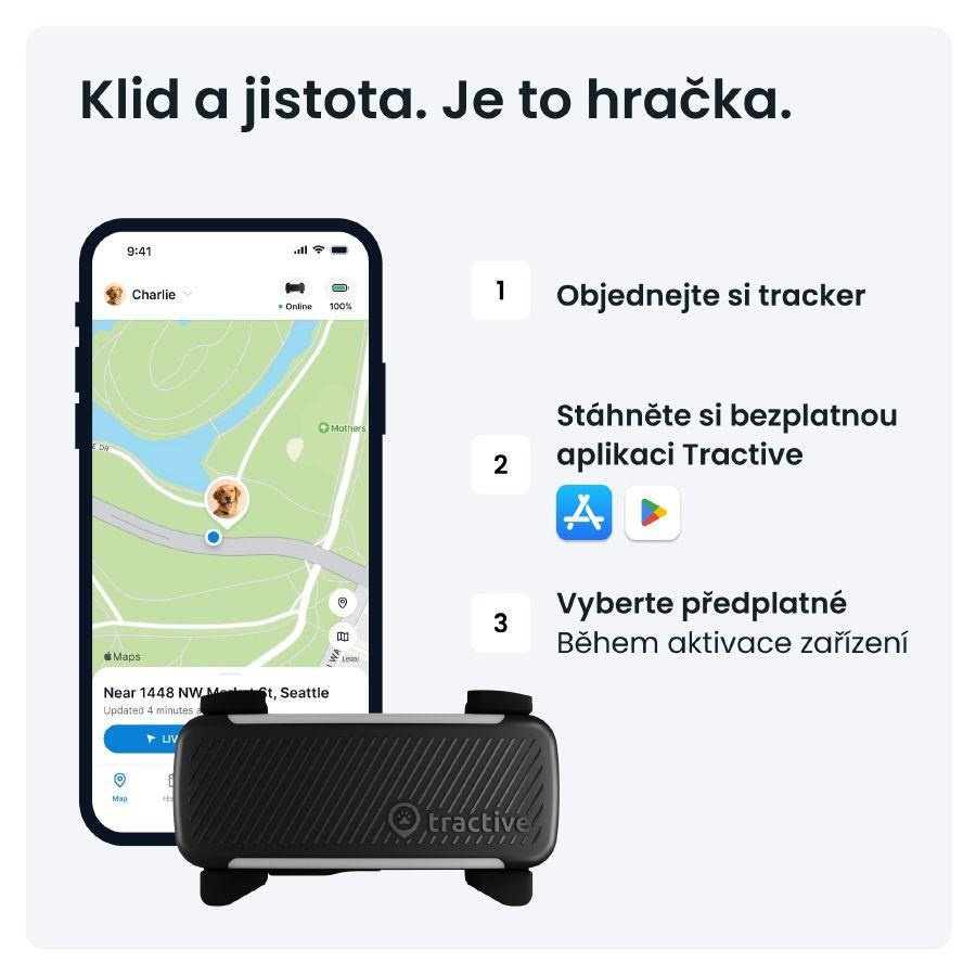 Zajistěte svému psovi bezpečí a zdraví s Tractive DOG 6: výkonným univerzálním GPS obojkem pro psy, který vám v reálném čase ukáže, kde přesně pes je, sleduje jeho spánek a aktivitu a nabízí řadu dalších funkcí. GPS lokátor pro psy má v České republice a v dalších více než 175 zemích neomezený dosah díky integrované SIM kartě, která se připojí k jakékoli partnerské síti (je nutná možnost připojení k mobilní síti). Vyberte si předplatné, které pokrývá náklady. Můžete si pořídit předplatné na měsíc, 1, 2 nebo 5 let už od 90 Kč / měsíc*.*Cena s předplatným na 2 roky a jednorázovou platbou předem. Ceny se mohou změnit. Nejnovější informace najdete na adrese tractive.com/plans.