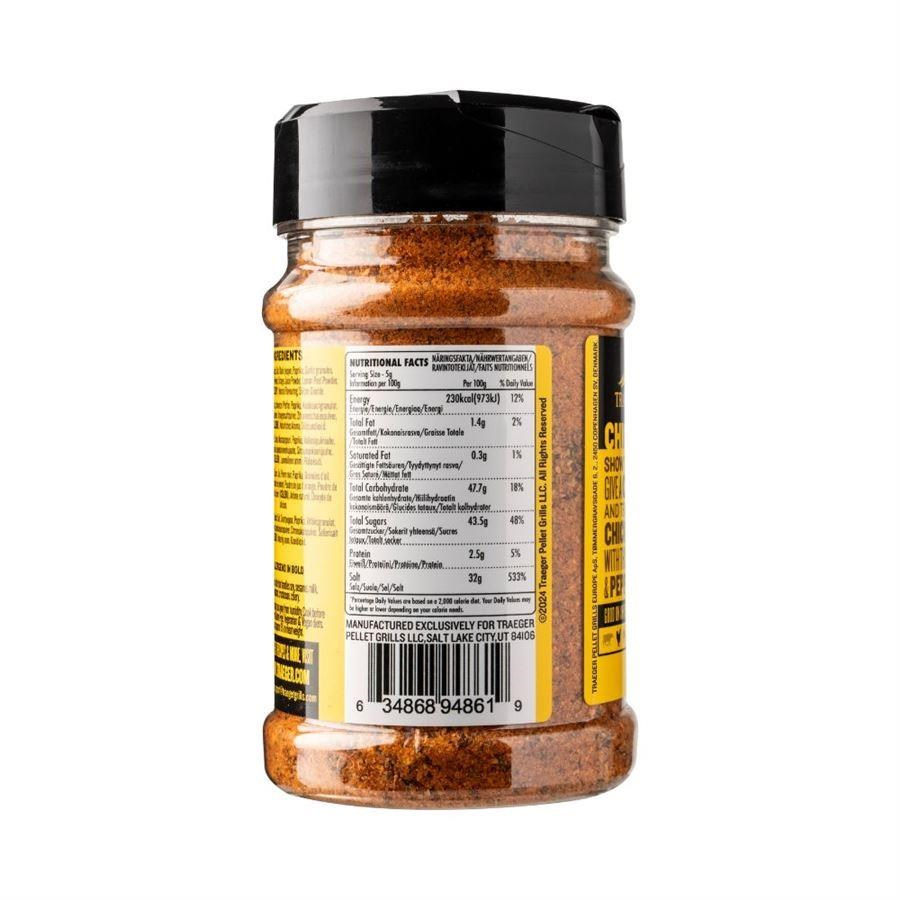 Od celého pečeného kuřete po krůtí burgery – dodávejte všem drůbežím pokrmům chuťový náboj s kořením Traeger Chicken Rub. Černý pepř a chilli prášek se spojují s citrusy a třtinovým cukrem a vytvářejí lahodně vyváženou přísadu do kuřecího masa a dalších drůbežích pokrmů.