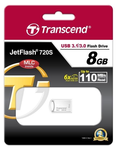 TRANSCEND Flash Disk 8GB JetFlash®720S, USB 3.1, MLC solution (R:110/W:25 MB/s) stříbná