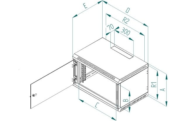 Rozvaděč Delta B je celosvařený nástěnný jednodílný rozvaděč s celoskleněnými dveřmi, které je možné díky masivním pantům otevřít pod úhlem téměř 180°. Důležitou součástí výrobku jsou otvory pro kabely, které jsou umístěny na horní a dolní stěně. Další dva otvory jsou umístěny na zadní stěně rozvaděče. Otvory jsou zaceleny vylamovacími záslepkami, které je možné vylomit s pomocí např. šroubováku. 19“ zařízení se instalují na vertikální lišty, které je možné plynule natavit podle potřeby do hloubky těla rozvaděče. Díky perforaci je zajištěna přirozená cirkulace vzduchu a chlazení komponentů. Přesné rozměry a další technické údaje jsou uvedeny níže (hodnoty R1 a R2 označují rozteče montážních otvorů pro zavěšení rozvaděče na zeď). Maximální zatížení rozvaděče je 30 kg. Rozměry: A – 635 mm B – 530 mm C – 490 mm D – 600 mm E – 395 mm R1 – 859 mm R2 – 420 mm Hmotnost – 20,5 kg Příbal: Klíč - přední dveře 2x Vrut 6x50 4x Podložka 6,6 4x Hmoždinka 10 4x Plastová podložka 8x Plovoucí matice M6 8x Šroub M6x16 8x Protiprachová záslepka 1x.