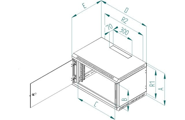 Rozvaděč Delta B je celosvařený nástěnný jednodílný rozvaděč s celoskleněnými dveřmi, které je možné díky masivním pantům otevřít pod úhlem téměř 180°. Důležitou součástí výrobku jsou otvory pro kabely, které jsou umístěny na horní a dolní stěně. Další dva otvory jsou umístěny na zadní stěně rozvaděče. Otvory jsou zaceleny vylamovacími záslepkami, které je možné vylomit s pomocí např. šroubováku. 19“ zařízení se instalují na vertikální lišty, které je možné plynule natavit podle potřeby do hloubky těla rozvaděče. Díky perforaci je zajištěna přirozená cirkulace vzduchu a chlazení komponentů. Přesné rozměry a další technické údaje jsou uvedeny níže (hodnoty R1 a R2 označují rozteče montážních otvorů pro zavěšení rozvaděče na zeď). Maximální zatížení rozvaděče je 30 kg. Rozměry: A – 900 mm B – 795 mm C – 490 mm D – 600 mm E – 395 mm R1 – 854 mm R2 – 420 mm Hmotnost – 26,6 kg Příbal: Klíč - přední dveře 2x Vrut 6x50 4x Podložka 6,6 4x Hmoždinka 10 4x Plastová podložka 8x Plovoucí matice M6 8x Šroub M6x16 8x Protiprachová záslepka 1x.