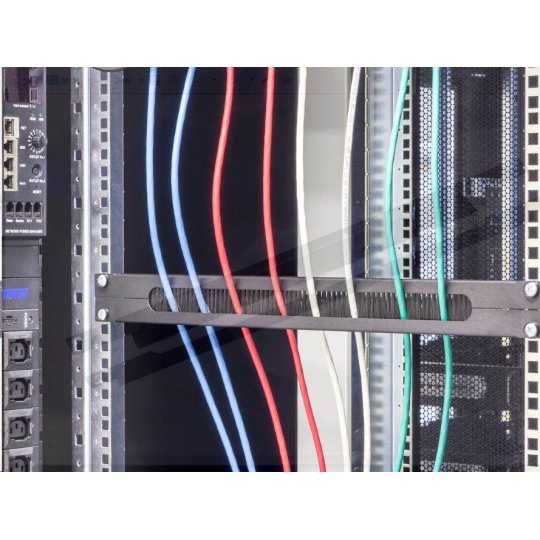 19" průchozí panel 1U rozdělený horizontálně, kartáč, otvor 350 x 21 mm.