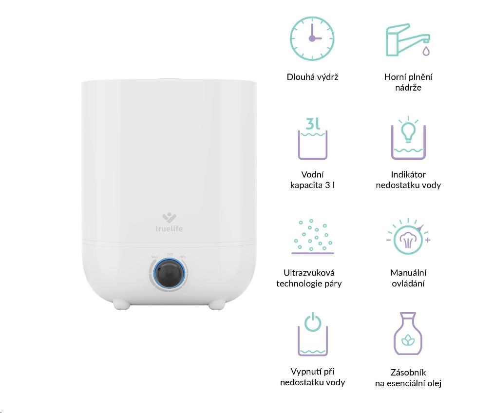 Pokud vás doma trápí suchý vzduch, jednoduchým řešením je zvlhčovač TrueLife AIR Humidifier H3. Zvlhčovač vzduchu oceníte hlavně v topné sezoně, svoje uplatnění ale najde i v létě. Díky hornímu plnění je obsluha zvlhčovače velmi jednoduchá, nádrž nemusíte nikam přenášet, neřešíte rozlitou vodu při každém použití. Funguje na principu ultrazvuku, vodu v nádrži mění na jemnou páru, která se mísí se vzduchem a okamžitě jej zvlhčuje. Výhodou ultrazvukové technologie je kromě nízké spotřeby energie i nízká hlučnost, dosahující maximálně 35 dB. Zvlhčovač funguje i jako difuzér. Stačí naplnit zásobník esenciálním olejem a zvlhčovač provoní díky technologii OilFlow® místnost vaší oblíbenou vůní.