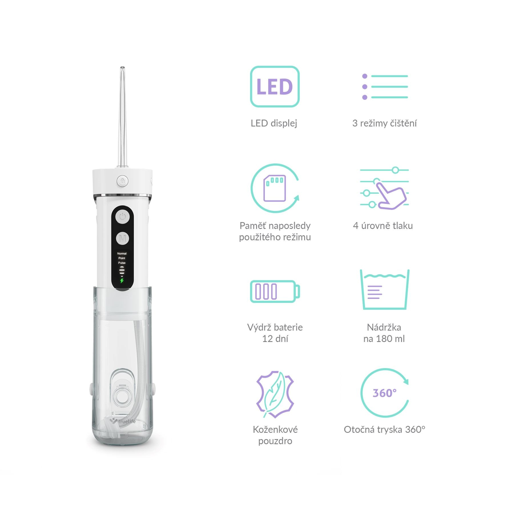 Doslova rájem pro bakterie jsou v ústní dutině mezizubní prostory. Chránit zuby před zubním kazem můžeme důkladným čištěním i těchto těžko dostupných míst. Ústní sprcha TrueLife AquaFloss Mini M50 je praktickým a komfortním pomocníkem. Poskytuje maximálně efektivní řešení díky 3 režimům čištění se 4 intenzitami tlaku pro každý z nich a technologii StreamTrue®, která odstraní až 99 % plaku a nečistot. Technologie PulseTrue® příjemně masíruje dásně a přispívá k jejich regeneraci. Funkce paměť si zapamatuje poslední použitý režim. Sprcha je nově vybavena také jedinečnou tryskou Bubble Spraying s technologií, jež rozpráší vodu po celé ploše zubu. Nádržku o objemu 180 ml snadno naplníte 3 různými způsoby a hlavice otočná o 360° je zárukou, že se dostanete do každého zákoutí. Ústní sprcha je skvělá na doma, ale i na cesty díky teleskopickému tělu, koženkovému pouzdro, možnosti uschovat trysku v horní části sprchy a výdrži baterie 12 dní.