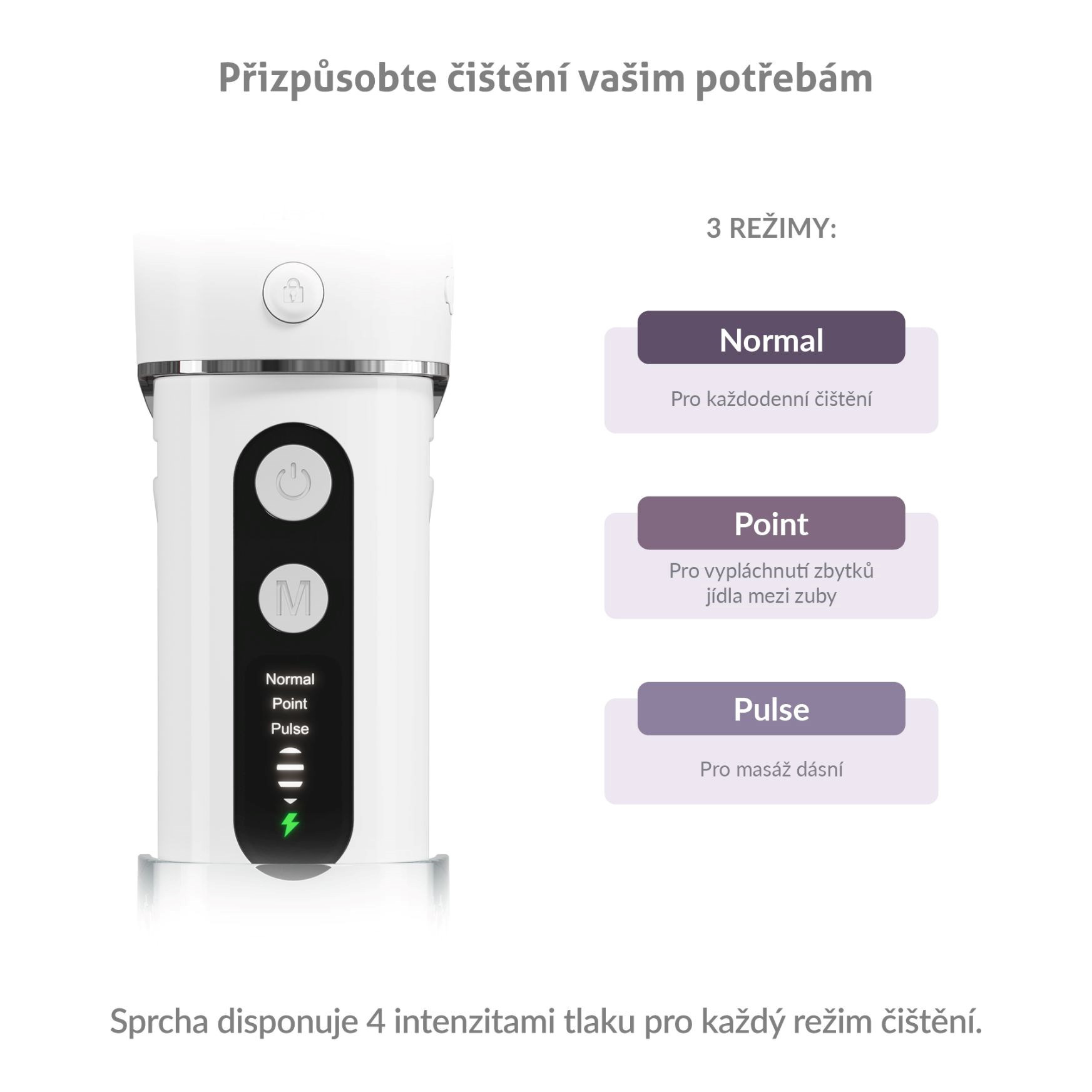 Sprcha poskytuje 3 režimy čištění s různými intenzitami tlaku (30 - 130 PSI). Normal pro běžné čištění, Point pro cílené a účinné odstranění zbytků jídla z mezizubních prostor a Pulse pro masáž dásní.