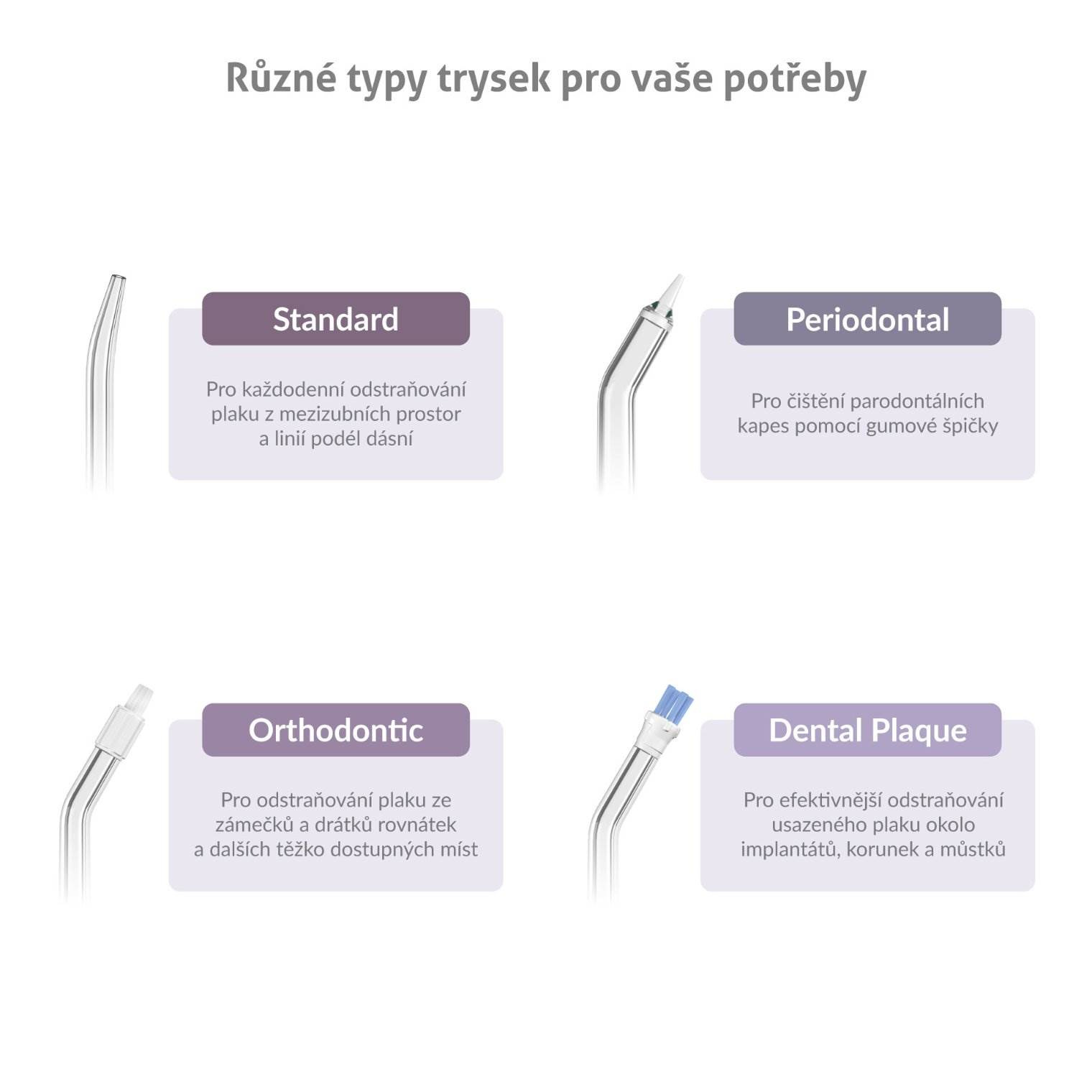 • Orthodontic – Ortodontická tryska pro odstraňování plaku ze zámečků a drátků rovnátek a dalších těžko dostupných míst.