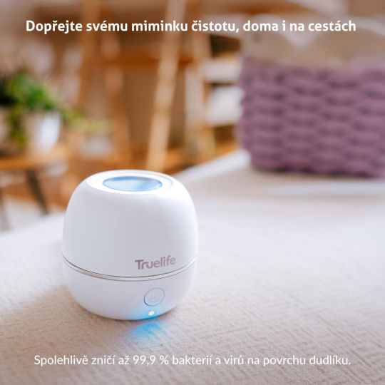S příchodem miminka se každý den naplní radostí, ale zároveň i okamžiky, kdy je potřeba jednat rychle. Stačí chvilka nepozornosti a dudlík skončí na zemi, zatímco vaše děťátko by ho chtělo mít zpátky co nejdříve. Právě v těchto chvílích vám pomůže Truelife Pacifier UV Sterilizer S3, malý a spolehlivý pomocník, který se díky své velikosti vejde do každé tašky, kabelky nebo kapsy kočárku. S praktickým silikonovým poutkem ho můžete mít neustále u sebe a být si jistí, že čistý dudlík je vždy po ruce. Sterilizace probíhá naprosto jednoduše a šetrně. Během tří minut spolehlivě zbaví dudlík až 99,9 % bakterií a díky bezpečnostnímu systému víka se spustí pouze tehdy, když je správně uzavřený. Průhledné okénko umožňuje proces sledovat, aniž by unikalo UV-C záření, a tělo z odolného plastu bez BPA zaručuje, že je sterilizace naprosto bezpečná pro děti. Vestavěná baterie zvládne až 50 cyklů na jedno nabití, takže se na sterilizátor můžete spolehnout kdykoliv a kdekoliv, ať už jste doma, na procházce nebo na cestách.