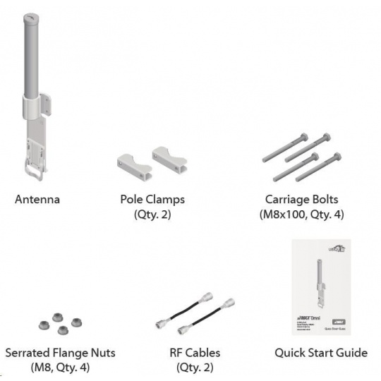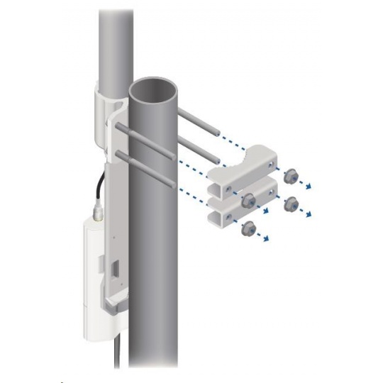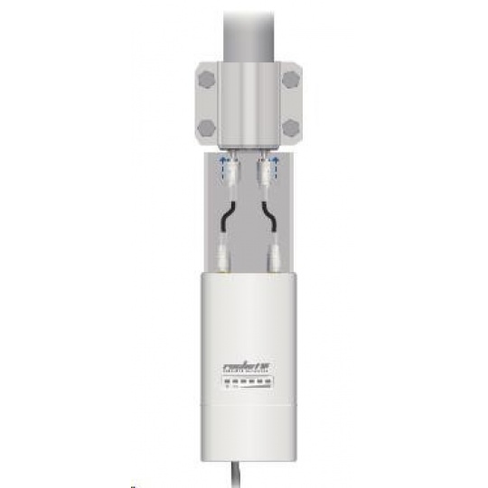 Jedná se o robusní řešení 10dbi všesměrové antény pro přístupové body pracující v pásmu 5GHz a využívajících standardu 802.11n v kombinaci s technologií MIMO. Anténa disponuje dvěma RSMA-female konektory. Součástí dodávky jsou dva voděodolné RSMA pigtaily pro propojení s jednotkou Rocket M5, držák pro tuto jednotku a montážní sada na stožár, viz. obr.