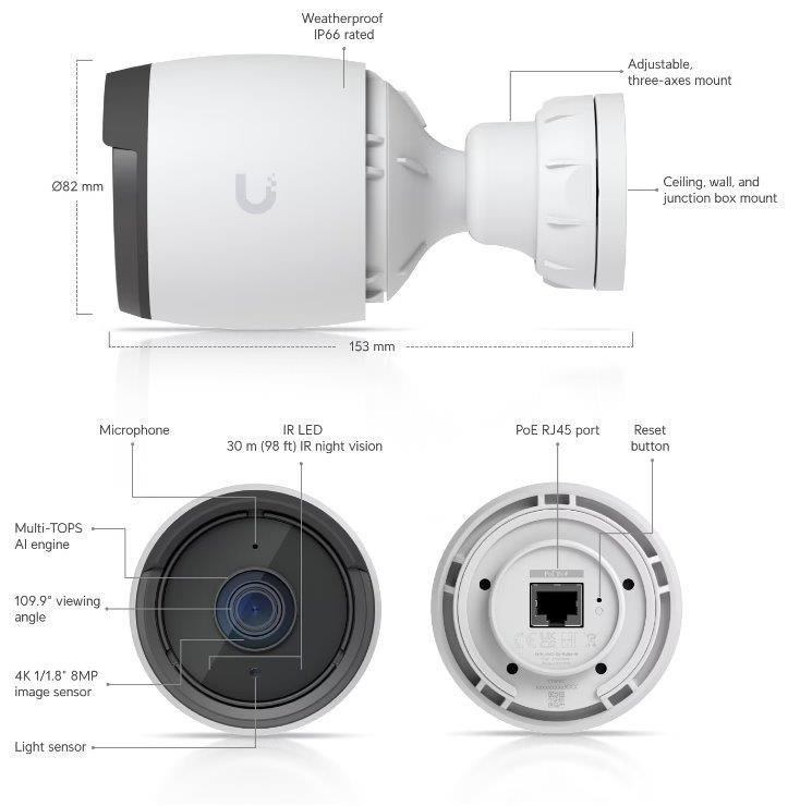 Popis produktu UniFi G6 Bullet kamera disponuje 8MP snímačem s rozlišením 3840 x 2160 při 30fps a objektivem s pozorovacím úhlem 109.9°, který je vybaven IR přísvitem pro noční vidění do vzdálenosti 30m. Dále je kamera vybavena mikrofonem pro záznam zvuku, 10/100 Mbps LAN portem s podporou PoE a stupněm krytí IP66 pro použití ve venkovním prostředí. Díky držáku jste schopni obraz směrovat ve všech 3 osách. Kameru je možné napájet pouze prostřednictvím PoE adaptéru nebo switche podporující standard 802.3af a pasivní PoE (36-57V DC). Maximální spotřeba kamery je 9,9W! AI funkce Díky implementaci AI kamera podporuje pokročilé detekce jako jsou detekce obličeje, detekce SPZ nebo chytré rozpoznání objektů (osoba, vozidlo, zvíře). Důležité vlastnosti • 8MP, 30 FPS video • AI chytré detekce • Noční režim s IR LED diodami • IP66 kryt odolný proti povětrnostním vlivům • Vestavěný mikrofon • Spravováno softwarem UniFi Protect • Odolnost vůči vandalům - IK04 Obsah balení • Zařízení • Šroubky + hmoždinky • Držák pro přichycení ke zdi • Kovová spona Technické parametry Kamera Typ objektivu:Fixní Přísvit:IR Dosah přísvitu [m]:30 Pozorovací úhel [°]:110 Režim den/noc:IR cut filtr Obrazový senzor ["]:1/1.8 Obraz Rozlišení:8MP Max. rozlišení [pixely]:3840 x 2160 (4K UHD) Konektory a rozhraní Audio:Mikrofon Rychlost LAN:(1) 10/100Mbps Napájení Napájení přes PoE:802.3af, 37 .. 57V DC Typ napájení:PoE Max. spotřeba energie [W]:9,9 Fyzické charakteristiky Stupeň krytí:IP66 Použití:Venkovní Antivandal (ochrana proti nárazu):IK4 Tlačítka:Reset Provozní teplota [°C]:-20 až 50 Hmotnost [g]:737 Šířka [mm]:82 Výška [mm]:82 Hloubka [mm]:153 Barva:Bílá Obecné Kamerová řada:UniFi Protect.