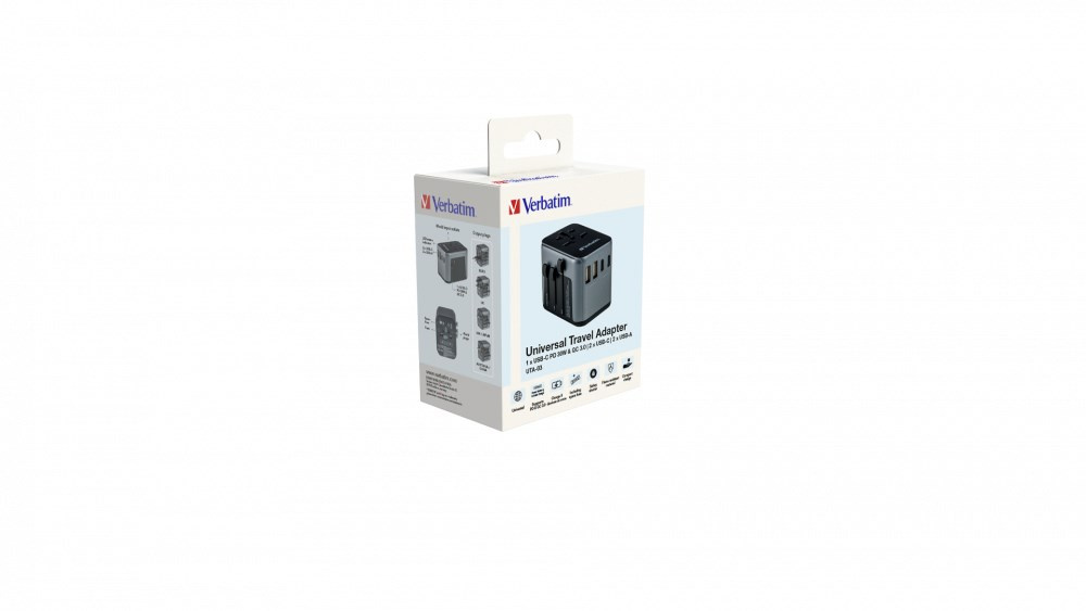 Pack Contents Verbatim UTA-03 Universal Travel Adapter with 1 x USB-C PD 30W & QC 3.0 / 2 x USB-C / 2 x USB-A