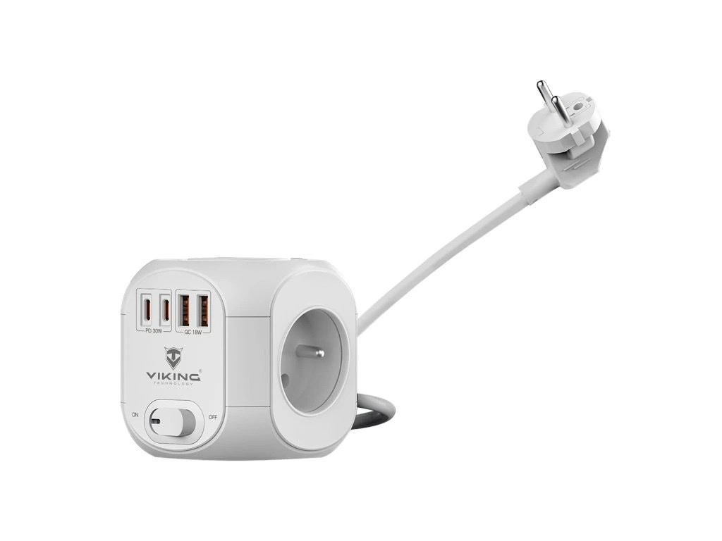Viking AC CUBE PD30 kombinuje čtyři USB porty (2× USB-C, 2× USB-A), čtyři síťové zásuvky a 1,8m prodlužovací kabel v jednom elegantním a prostorově úsporném zařízení. Umožňuje současně napájet až osm spotřebičů nebo elektroniky, aniž by zbytečně zabíral místo na pracovním stole.