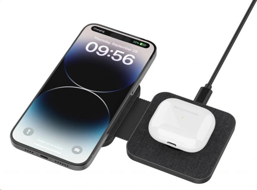 Nabíječka nabízí dva bezdrátové výstupy, které umožňují nabíjení dvou zařízení současně, což je ideální pro mobilní telefony, hodinky a sluchátka. Výstupní výkon pro mobilní zařízení dosahuje až 15W, zatímco pro hodinky a sluchátka poskytuje výkon až 2,5W. Součástí balení je také USB-C kabel o délce 1 m, který zajišťuje kompletní vybavení pro rychlé a efektivní nabíjení.
