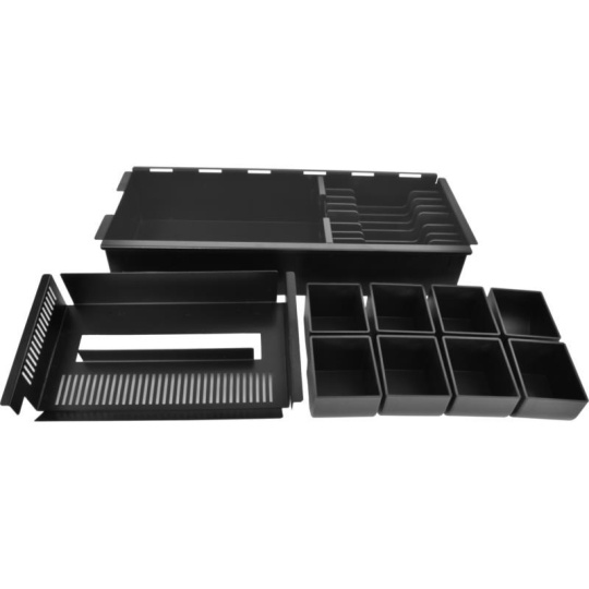 • Vyjímatelný kovový pořadač s nastavitelnými plastovými oddělovači přihrádek pro bankovky
